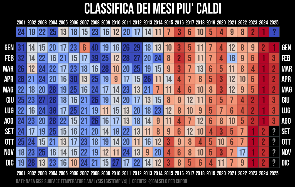 Classifica mensile di temperatura media globale per il periodo 2001-oggi. Conoscendo le temperature globali medie per ogni mese, possiamo costruire una sorta di classifica dei mesi più caldi a partire dal 1880. Ad esempio possiamo vedere quale sia stato il marzo più caldo, o il secondo agosto più caldo, o il terzo novembre più caldo, eccetera. Il numero corrisponde alla posizione in classifica. Quindi ad esempio 1 sulla riga del mese di aprile indica l'anno dall'aprile piu' caldo, 2 l'anno del secondo aprile piu' caldo, 20 l'anno del ventesimo aprile piu' caldo, eccetera. Per visualizzarlo meglio coloriamo le posizioni in classifica dal rosso scuro (più caldo) al blu scuro (più freddo). Dal grafico notiamo come i mesi più vicini ai nostri giorni siano effettivamente tra i più rossi, e quindi più caldi. Notiamo anche come non serva andare troppo indietro negli anni per trovare il mese più caldo mai misurato. Questo ancora una volta mostra che il nostro pianeta si sta scaldando come mai sia stato registrato fino ad ora.