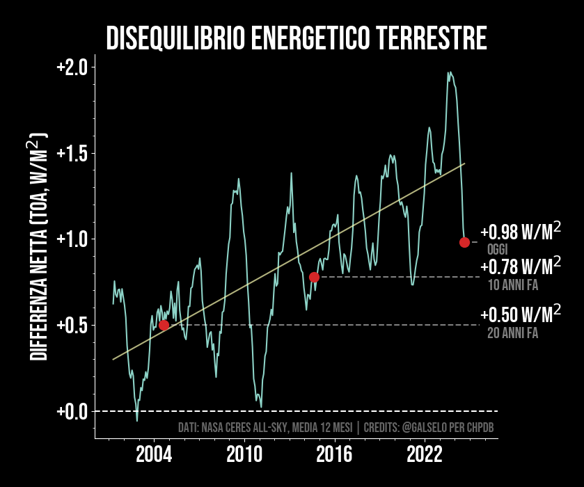 Il disequilibrio energetico radiativo terrestre rappresenta una misura chiave per valutare l'impatto del cambiamento climatico. I dati raccolti dal programma CERES (Clouds and the Earth's Radiant Energy System) della NASA, attraverso le misurazioni TOA all-sky (Top of Atmosphere), sono fondamentali per comprendere questo fenomeno. Le misurazioni TOA all-sky consentono di monitorare l'energia solare riflessa e assorbita dalla Terra, nonché l'energia termica emessa verso lo spazio. Attraverso queste misurazioni, è stato osservato un disequilibrio energetico radiativo, con una quantità maggiore di energia solare assorbita dalla Terra rispetto a quella emessa nello spazio. In pratica con una differenza netta positiva (quindi sopra la linea tratteggiata) porta ad un riscaldamento terrestre. Come indicato dalla linea gialla il trend è di crescita costante. Questo disequilibrio è il risultato dell'aumento dell'effetto serra causato dall'aumento delle concentrazioni di gas serra nell'atmosfera.