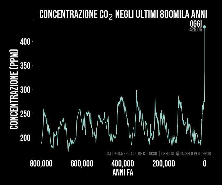 Concentrazioni di CO2 in atmosfera per gli ultimi 800000 anni.