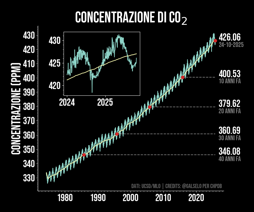 Concentrazioni di CO2 in atmosfera per il periodo 1958-oggi. Ormai sappiamo che la ragione del riscaldamento globale è la presenza di gas serra prodotti dalle attività umane. Uno di questi è l'anidride carbonica (CO2). Fin da quando siamo in grado di misurarla ci siamo resi conto del suo costante aumento. Dal grafico è possibile notare i cicli stagionali in verde e la loro media in giallo. Da notare anche il fatto che gli intervalli di dieci anni riportati a lato diventano sempre più radi, indicando un'accelerazione del processo. L'unità di misura (ppm) indica parti per milione, che, a prima vista, potrebbe suggerire una concentrazione relativamente bassa rispetto alle altre molecole che compongono la nostra atmosfera (cioè 400 ppm significa 400 molecole di CO2 ogni milione di molecole). In questo caso però piuttosto che la massa della molecola in questione contano le proprietà ottiche e spettroscopiche, ovvero quanto "grande" una molecola viene vista dalla radiazione termica emessa dal nostro pianeta. E per questo motivo una differenza di qualche centinaio di ppm può far variare la temperatura terrestre di molto.