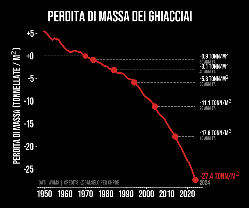 La perdita di massa dei ghiacciai a livello mondiale rappresenta una delle evidenti conseguenze del cambiamento climatico in corso. Gli effetti delle crescenti temperature globali si manifestano in modo drammatico nei ghiacciai, che si stanno ritirando e perdendo massa a un ritmo allarmante. Questa perdita di massa dei ghiacciai contribuisce alla crescita dei livelli dei mari, aumentando il rischio di inondazioni costiere e minacciando le comunità ecosistemi che dipendono dall'acqua dolce derivante dallo scioglimento dei ghiacciai. Inoltre, la scomparsa dei ghiacciai mette in pericolo le riserve di acqua dolce a lungo termine, poiché sono una fonte vitale di approvvigionamento per molti fiumi e bacini idrici.