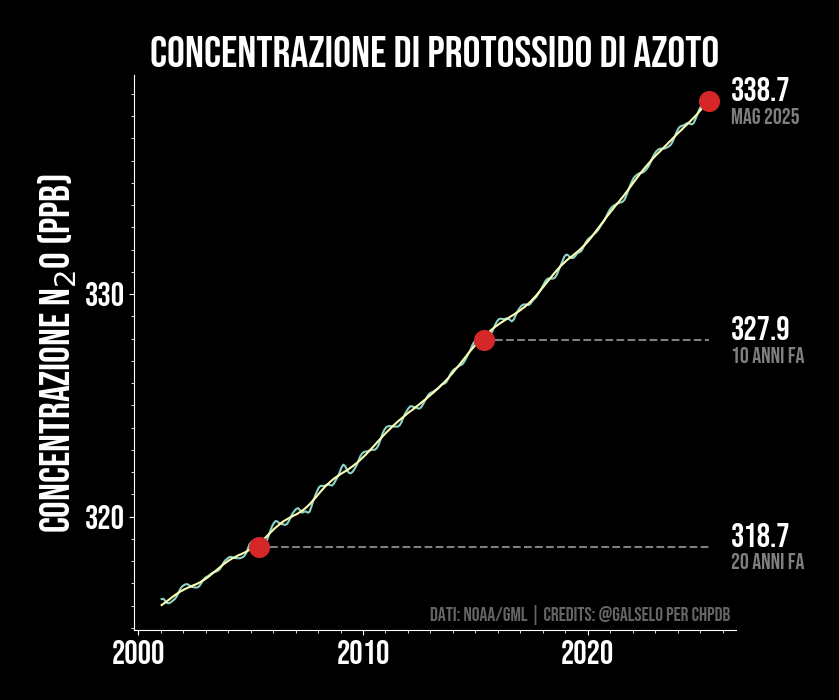L'anidride carbonica non è l'unico gas serra presente in atmosfera. Il protossido di azoto (N2O) è un altro di quelli emessi da attività umane (specialmente relative ad agricoltura ed allevamenti), anche questo in aumento. Analogamente all'anidride carbonica (CO2), anche il protossido di azoto è un gas abbastanza inerte chimicamente (cioè reagisce con meno probabilità di altri gas), il che implica una vita atmosferica molto lunga. Questo significa che una volta emesso impiega tempi molto lunghi per essere rimosso dall'atmosfera. Se i tempi di emissione accelerano il gas tende ad accumularsi come vediamo dal grafico.