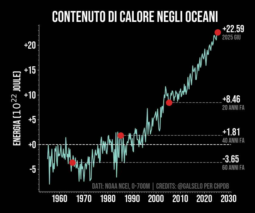 Anomalie del contenuto di calore oceanico per il periodo 1956-oggi. Il contenuto di calore degli oceani è probabilmente l'indicatore chiave del riscaldamento globale in atto in quanto oltre il 90% del calore in più assorbito dal nostro pianeta finisce negli oceani, limitando parte dell'aumento delle temperature sulla superficie terrestre. Il calore assorbito dagli oceani ha contribuito alla fusione dei ghiacci polari, all'aumento del livello del mare e alla modifica dei modelli di circolazione oceanica.