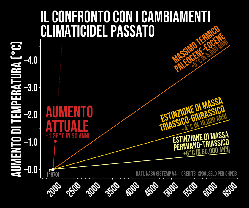 Il cambiamento climatico moderno è 10 volte più veloce rispetto agli eventi storici di riscaldamento globale che hanno causato estinzioni di massa. Questi eventi, come l'Estinzione del Permiano e il Massimo Termale Paleocene-Eocene (PETM), richiesero aumenti di temperatura di 4-5 gradi Celsius e causarono la scomparsa di molte forme di vita. Tuttavia, il tasso attuale delle emissioni di carbonio è 10-100 volte più rapido rispetto a quei periodi, portando già a un quarto del riscaldamento previsto.