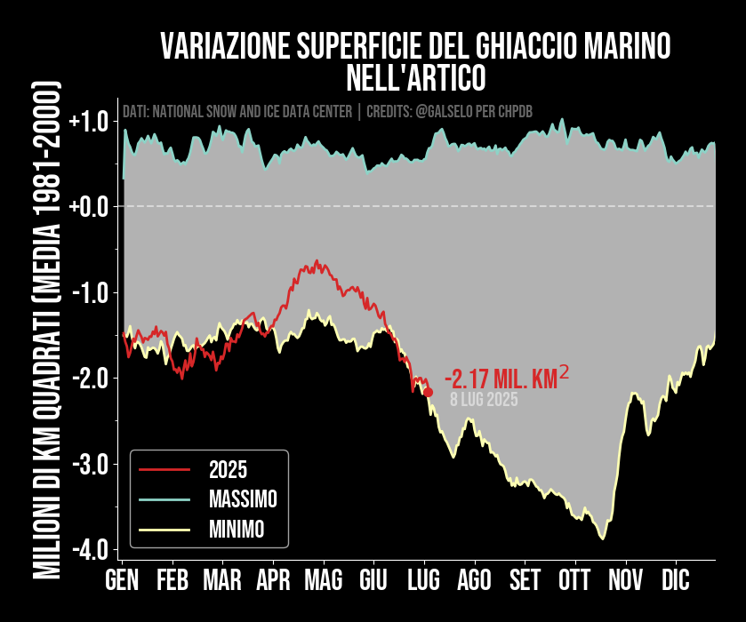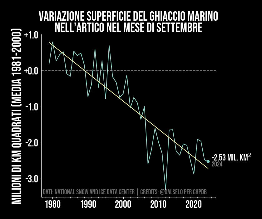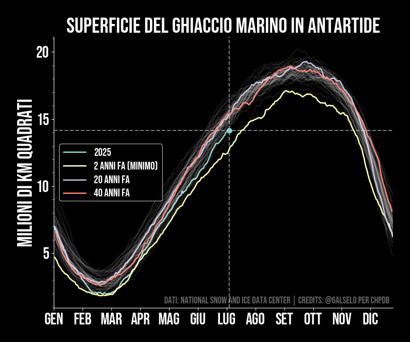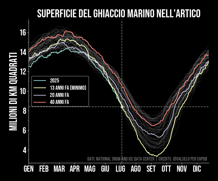 Il ghiaccio marino nell'Artico (Polo Nord) dipende fortemente dalla temperatura delle acque superficiali. In inverno e primavera, quando c'è poco sole, il ghiaccio tende a tornare sempre ai livelli precedenti, o molto vicino. Questo lo vediamo nel grafico, dove si nota l'oscillazione stagionale. Adesso però quando arriva l'estate, grazie all'elevata temperatura delle acque superficiali, il calore fa sciogliere una parte sempre maggiore dei ghiacci. Infatti nel grafico notiamo che la superficie dei ghiacci è diminuita nel corso degli anni, rispetto ad esempio a 40 e 20 anni fa. I ghiacci artici giocano un ruolo fondamentale nel determinare la temperatura del pianeta. Più ghiacci si sciolgono, meno coprono le acque superficiali marine, che invece assorbono molto più calore dei ghiacci. Questo innesca un cosiddetto feedback positivo che aumenta il riscaldamento ancora di più. Infatti secondo i modelli da qui a pochi anni rischiamo di avere un'estate senza ghiaccio, cosa che contribuirebbe in modo determinante al riscaldamento totale.