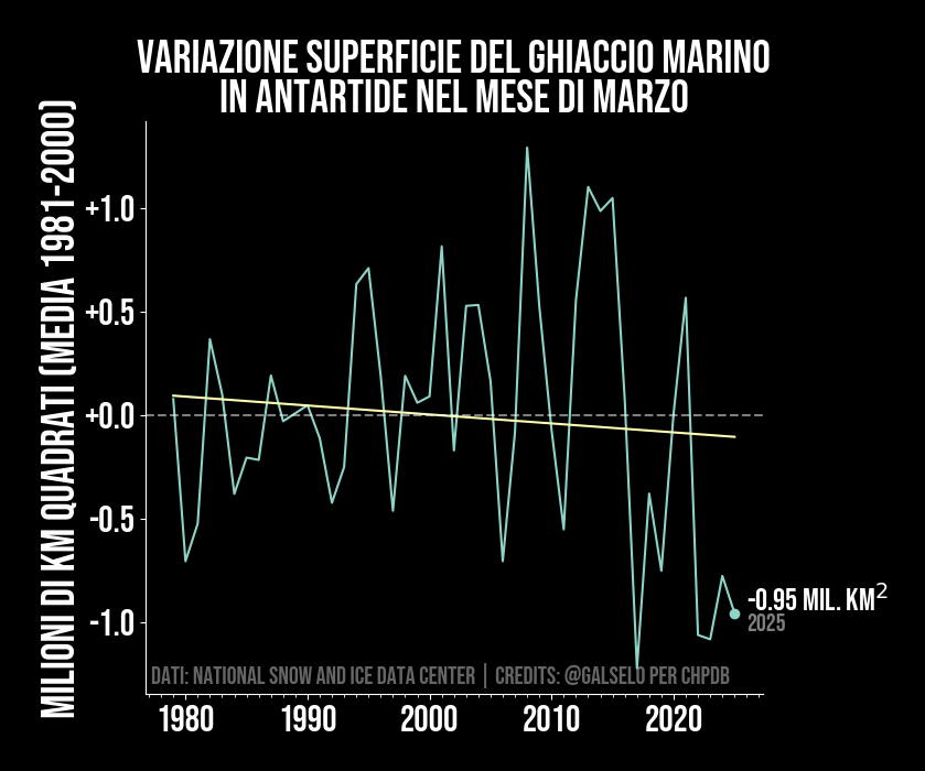 Il comportamento del ghiaccio marino in Antartide è molto più complicato di quello in Artico, data la presenza dei ghiacciai continentali Antartici, e per via delle modifiche nella circolazione stratosferica dovute al recupero dell'ozono stratosferico nell'emisfero sud. Per questo motivo, i dati riguardanti il trend dei ghiacci marini antartici sono molto più rumorosi e complicati da analizzare rispetto a quelli artici. Tuttavia negli ultimi anni anche in Antartide si stanno battendo alcuni record di riduzione dei ghiacci marini.