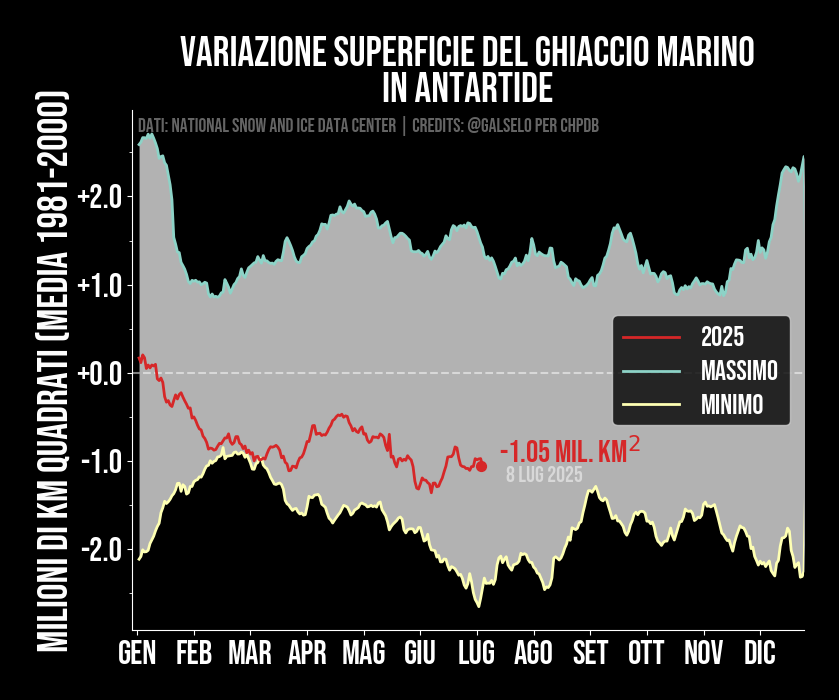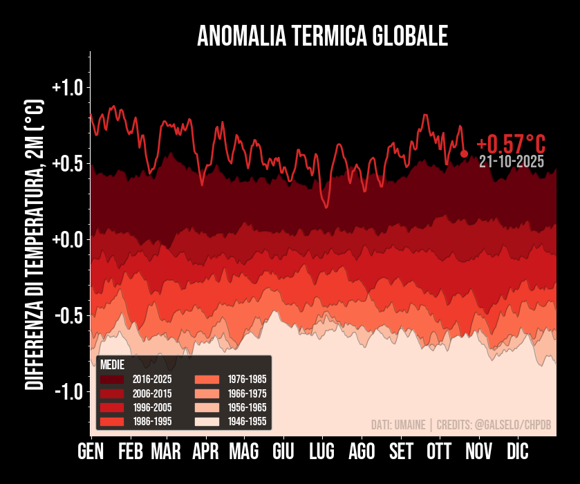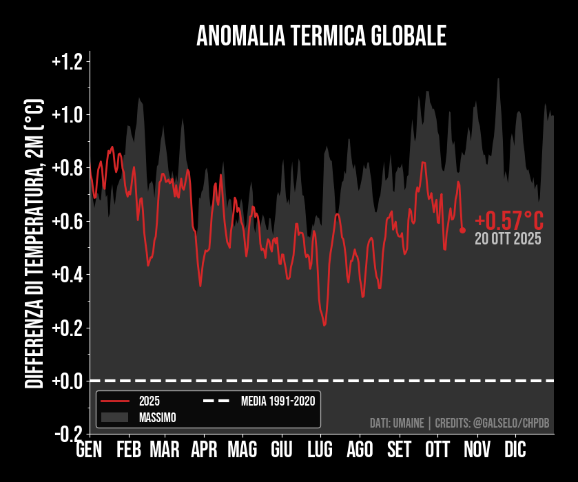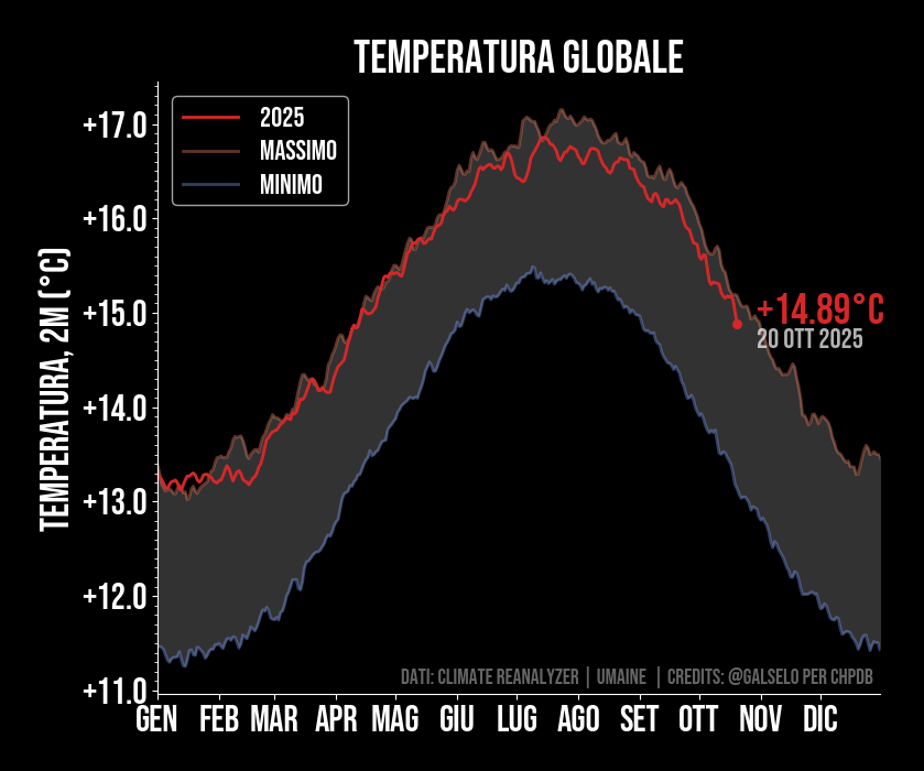 Anomalia giornaliera globale rispetto al periodo 1979-2000. Grazie ai dati satellitari e le rianalisi climatiche è possibile determinare ogni giorno la temperatura del nostro pianeta. Questo grafico mostra l'ultima temperatura globale disponibile (indicata dalla data) rispetto alla massima e alla minima mai registrata. Si tratta della temperatura misurata a due metri da terra, ovvero quella misurata da ipotetiche centraline meteo. Le linee indicanti il massimo e il minimo si riferiscono invece a tutti gli anni precedenti a quello corrente. Ogni volta che la linea rossa esce dalla regione compresa fra il massimo (rosso chiaro) o il minimo (rosso scuro) siamo in presenza di condizioni anomale. Se la linea rossa si trova al di sopra della linea rossa chiara siamo in presenza di un record.