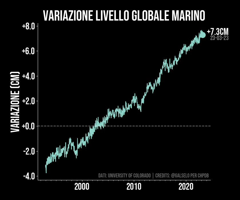Variazione del livello del mare rispetto al periodo di riferimento. Il volume delle acque oceaniche dipende da vari fattori: uno di questi è che le acque più calde occupano più volume (il cosiddetto effetto termosterico). Un altro fattore è la fusione dei ghiacciai continentali. Lo vediamo nel grafico che mostra un costante aumento del livello marino misurato. Anche se sembra poco, una variazione di alcuni centimetri può mettere a rischio isole e ambienti costieri, che si troveranno più a rischio da mareggiate. È come aggiungere uno sgabello sotto ad un canestro nel basket: se prima solo i pochi giocatori veramente alti riuscivano a schiacciare (ovvero solo le mareggiate maggiori facevano danni ingenti) adesso anche alcuni dei giocatori meno alti possono arrivare a schiacciare (ovvero anche mareggiate meno importanti riescono a fare danni elevati).