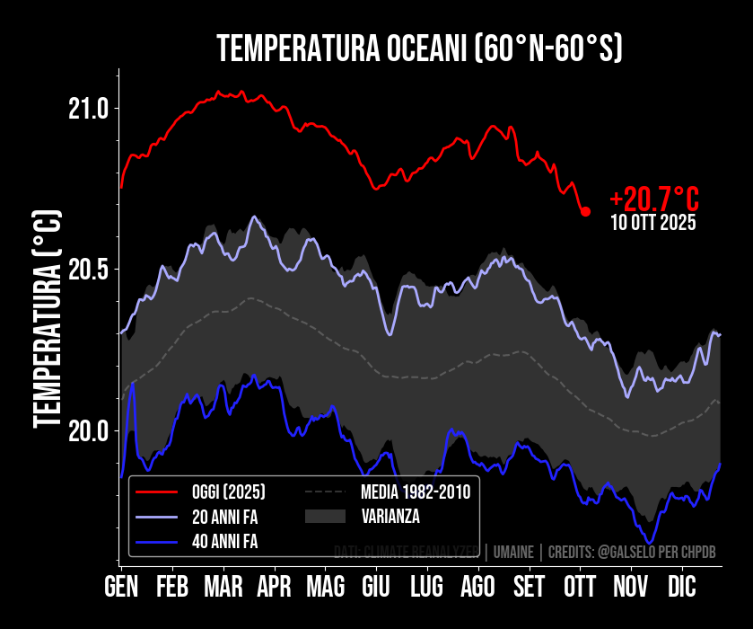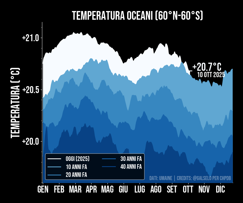 Oltre il 90% del calore assorbito dal nostro pianeta finisce negli oceani. Questo è facilmente osservabile dalla temperatura superficiale degli oceani, mostrata in questa figura. Qui viene riportata la temperatura superficiale degli oceani misurata tra le latitudini 60 nord e 60 sud. Notiamo che la temperatura degli oceani oggi e’ piu’ alta rispetto a 20 o 40 anni fa (linee piu’ chiare sul grafico). La sua variazione dipende da fenomeni stagionali ma anche da meccanismi oceanici che durano diversi anni, come l’oscillazione ENSO (El Niño-Southern Oscillation) che, nei due estremi chiamati El Niño e La Niña porta a temperature oceaniche rispettivamente più calde o più fredde. Ma il cambiamento climatico annuale sta portando a fenomeni di El Niño più intensi, come si vede nella linea del 2023, che è quasi mezzo grado più alta delle temperature “normali” (indicate dalla regione grigia attorno alla media)!