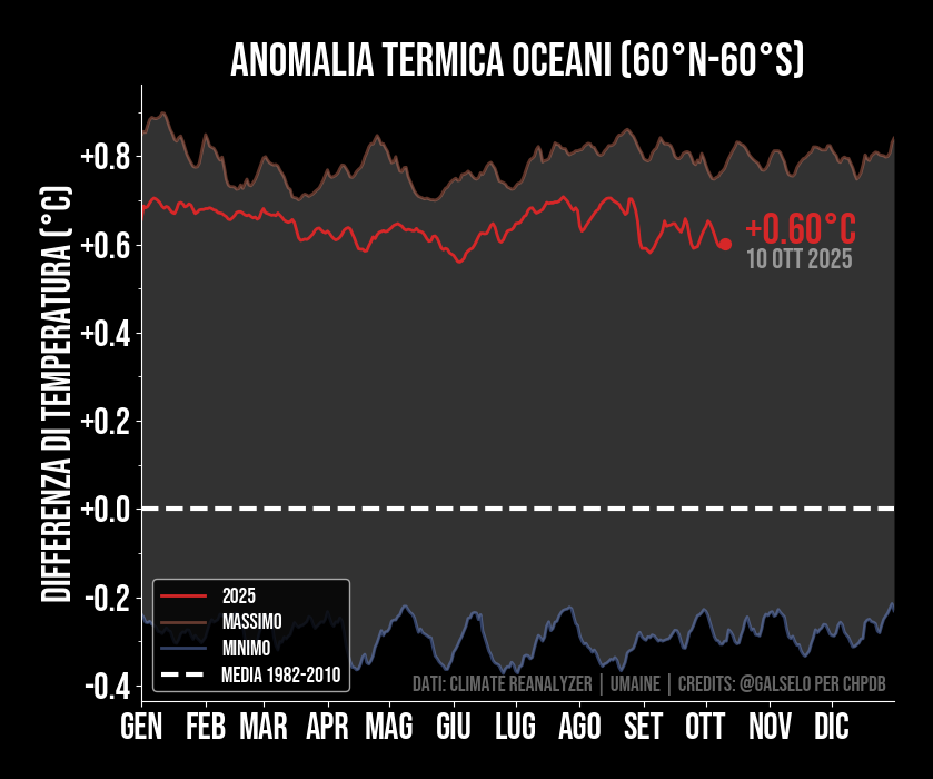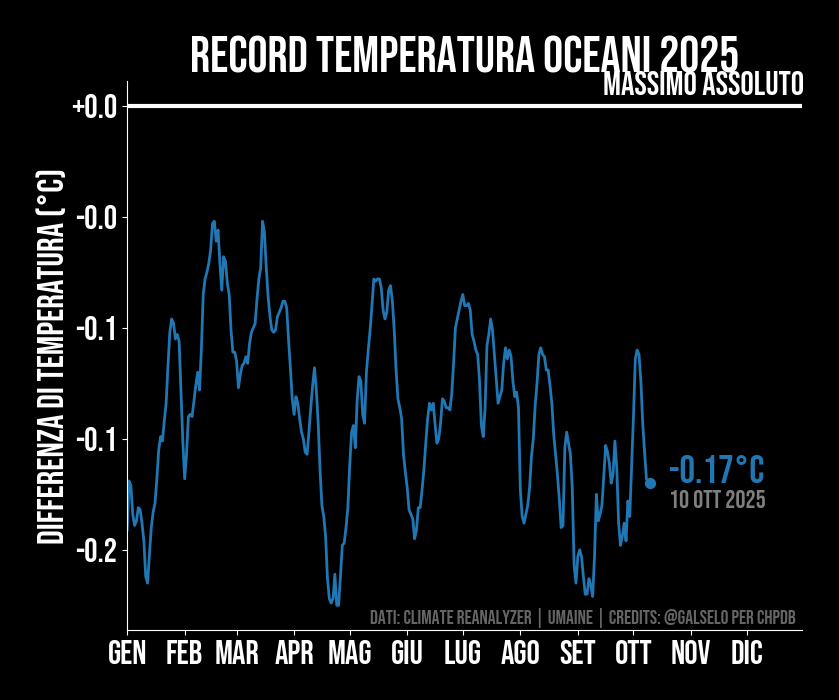 La temperatura dell'oceano per l'anno corrente rispetto al massimo delle misurazioni 1981-2022. Ogni volta che viene superato il massimo usiamo il colore rosso, che corrisponde ad un record per quel giorno. Sebbene i dati partano dal 1981, i record sono comunque significativi dato che sappiamo da altri metodi di misura che le temperature oceaniche sono in costante aumento a causa delle emissioni antropiche di gas serra.