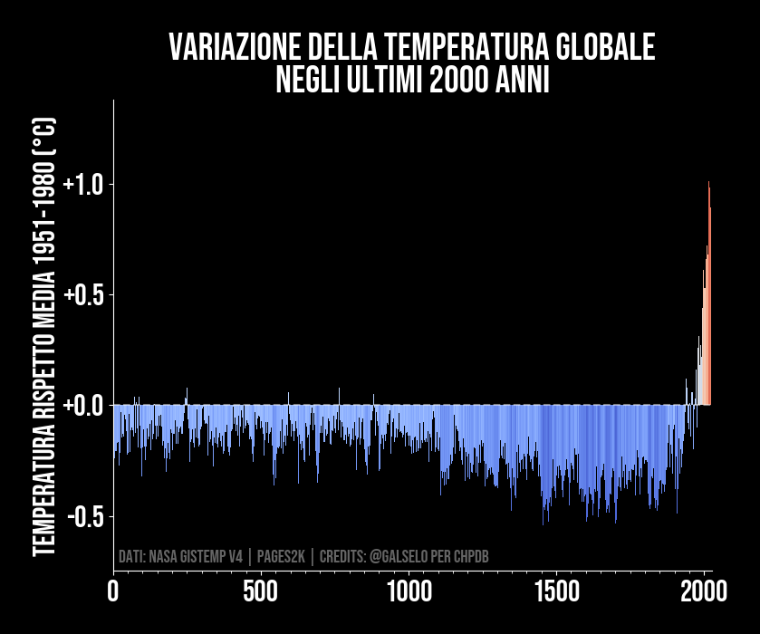 Anomalia di temperatura media globale per gli ultimi 2000 anni rispetto al periodo 1951-1980. Grazie alle informazioni degli isotopi dei gas contenuti nei ghiacci millenari, a quelle degli anelli degli alberi, dei pollini, dei sedimenti marini e dei depositi minerali è possibile risalire a quale fosse la temperatura nel passato del nostro pianeta. In particolare in questo grafico si mostrano le temperature degli ultimi 2000 anni. E anche in questo caso si nota che l’anomalia di temperatura media rispetto al periodo 1951-1980 non sia mai stata elevata come oggi. Dato che ogni tacca sull’asse orizzontale rappresenta 50 anni, vediamo come siano bastate solamente due tacche (ovvero 100 anni) per riscaldare il pianeta. Questo grafico evidenzia la velocità con la quale stiamo modificando la nostra atmosfera.