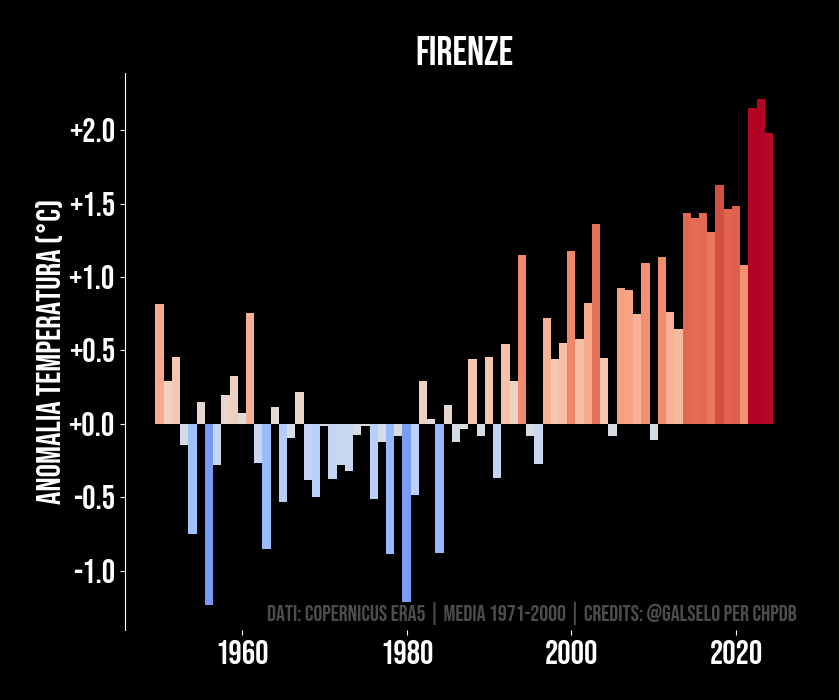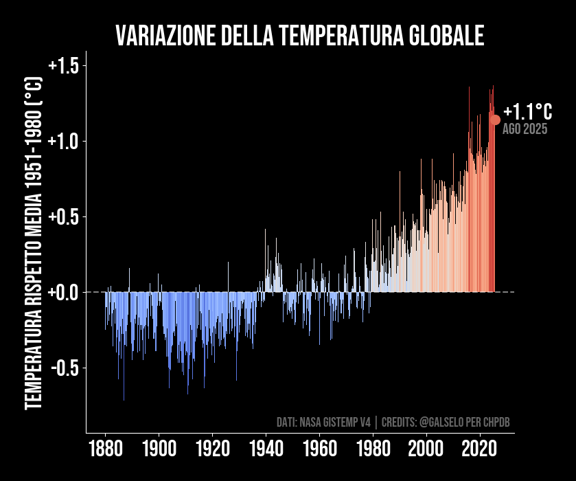Questo grafico mostra quante volte durante l'anno corrente il nostro pianeta ha superato la temperatura massima registrata a partire dal 1979. Ogni volta che la temperatura supera il massimo della serie storica per quel dato giorno usiamo la linea rossa, altrimenti il blu. Nonostante i dati partano dal 1979, i record sono comunque significativi visto che gli anni precedenti al 1979 sono comunque più freddi di quelli attuali. I dati sono aggiornati con cadenza quasi giornaliera.