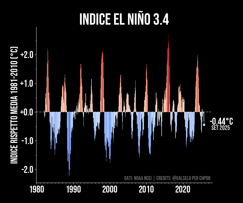 L'indice El Niño nella regione 3.4, noto anche come Indice SST (Sea Surface Temperature) della regione Niño 3.4, è un parametro ampiamente utilizzato per monitorare e valutare l'andamento del fenomeno climatico El Niño. Questa regione specifica si estende in una fascia dell'oceano Pacifico equatoriale centrale, compresa tra le latitudini 5°N e 5°S e le longitudini 120°W e 170°W. L'indice El Niño nella regione 3.4 si basa sulla misurazione della temperatura superficiale dell'oceano in questa zona durante un periodo specifico, generalmente utilizzando una media menisle. L'indice riflette le anomalie termiche rispetto alla media storica e fornisce informazioni cruciali per valutare l'intensità e lo sviluppo di El Niño. I valori positivi dell'indice indicano temperature dell'oceano più elevate del normale, suggerendo l'insorgenza di un evento El Niño, mentre i valori negativi sono associati a condizioni di La Niña, caratterizzate da temperature più basse.