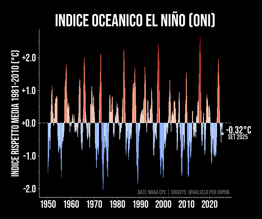 L'Oceanic Nino Index (ONI) è un indice utilizzato per misurare le anomalie termiche nell'oceano Pacifico centrale e valutare il fenomeno climatico dell'El Niño-Oscillazione Meridionale (ENSO). Calcolato sulla base della temperatura superficiale nelle regioni Niño 3.4, l'ONI fornisce una misura standardizzata dei cambiamenti termici e aiuta a monitorare l'evoluzione di El Niño e La Niña. Questo indice è fondamentale per comprendere gli impatti globali dell'ENSO, tra cui fenomeni meteorologici estremi. A differenza dell'indice 3.4, l'indice ONI è una media mobile a tre mesi calcolata rispetto alla media 1981-2010.
